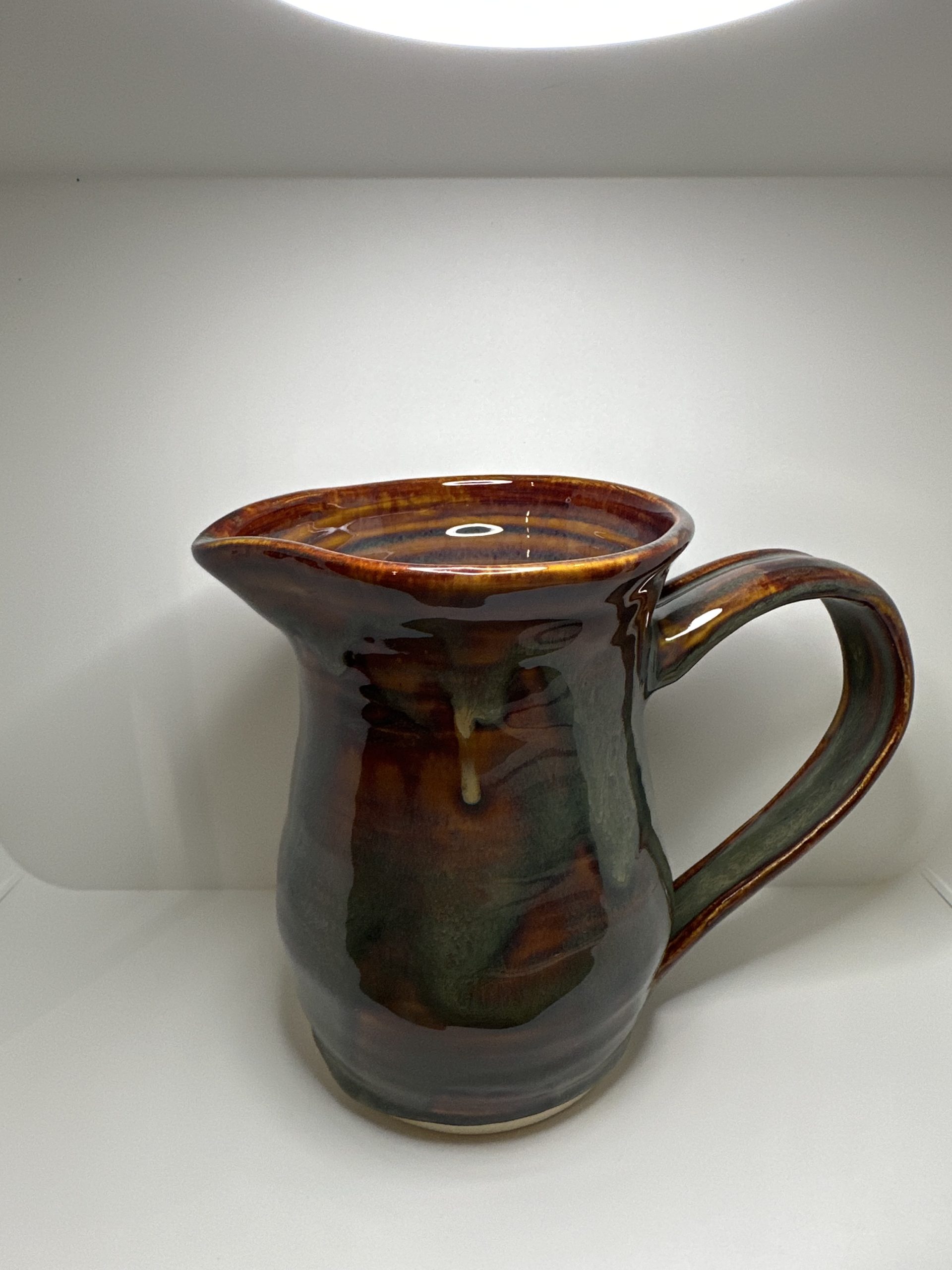 A small, wide-handled pitcher, in a green and brown glaze.